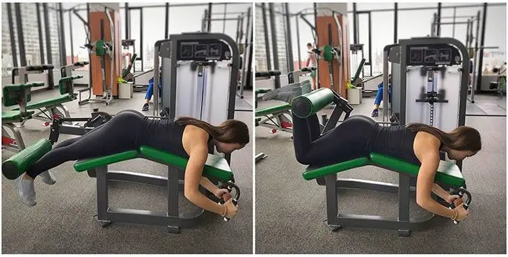 - Deite-se de bruços em uma máquina de flexão de pernas com os calcanhares contra a almofada.